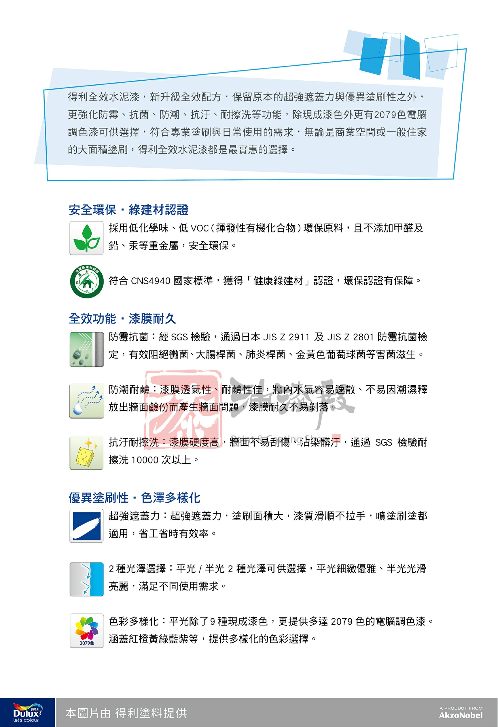 相較於樹脂含量高、質地細緻、功能多樣的乳膠漆來說,水泥漆屬於經濟實惠型的基本款塗料,水泥漆因粉料比例較高,一般都具有遮蓋力佳、容易塗刷等基本塗刷性能,適合用在大面積塗刷及不需特別注重牆面細緻質感的空間,如商業空間、店面、辦公室、樓梯間、地下室等。 得利全效水泥漆,新升級全效配方,保留原本的超強遮蓋力與優異塗刷性之外,更強化防霉、抗菌、防潮、抗鹼、耐擦洗等功能,除現成漆色外更有2079色電腦調色漆可供選擇,符合專業塗刷與日常使用的需求,無論是商業空間或一般住家的大面積塗刷,得利全效水泥漆都是最超值的選擇。