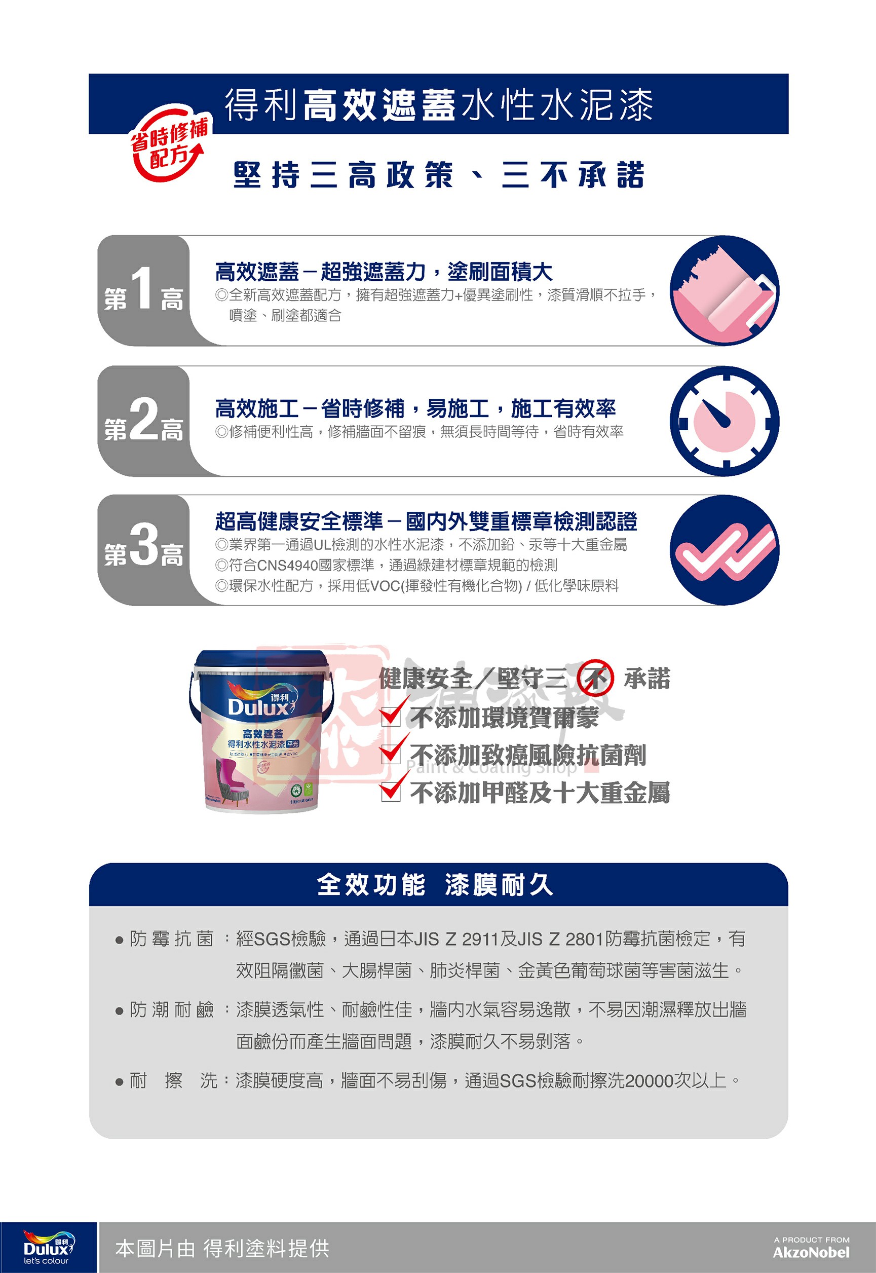 具備高遮蓋力,施工方便,業界第一通過UL檢測的水泥漆。建議塗布至少2道,1加侖可塗刷6坪(刷2道的面積)。