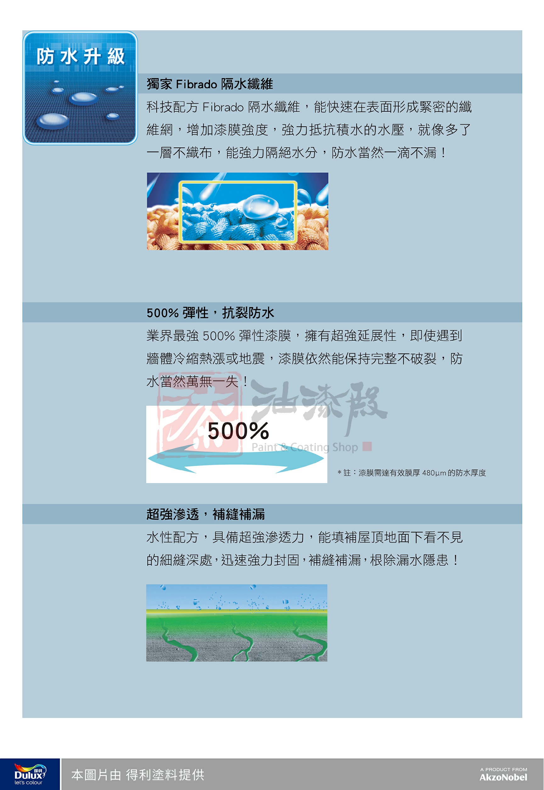 獨特科技配方 Fibrado 隔水纖維,能快速在表面形成緊密纖維網,增加漆膜強度,強力抵抗積水的水壓,就像多了一層不織布,能強力阻隔水分,防水當然一滴不漏!
