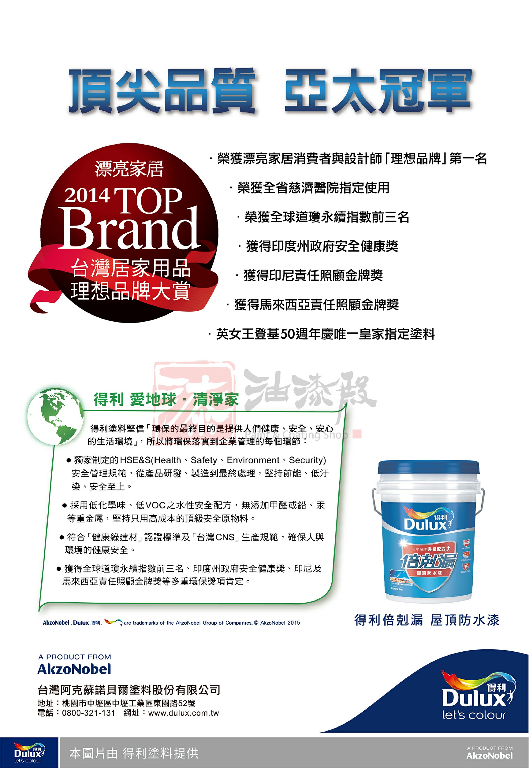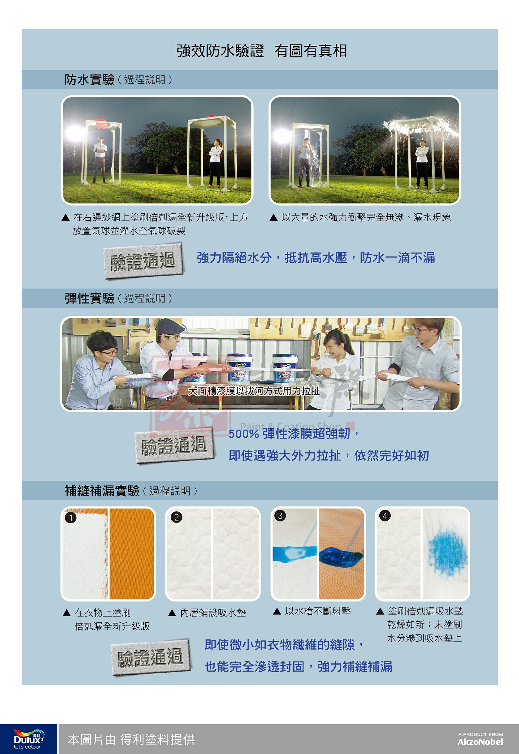 想要一次搞定防水、隔熱,就用得利倍剋漏∘顛覆傳統防水漆延展性差、日曬容易變硬脆化的缺點, 得利倍剋漏防水超耐配方,含Fibrado隔水纖維和具備500%漆膜彈性,還加了長效耐候雲母, 提高漆膜耐酸鹼性,漆膜耐候的強度變強,就不怕酸雨或是長時間曝曬在陽光下,防水效果更持久, 這就是倍剋漏效果長達5年的秘密。