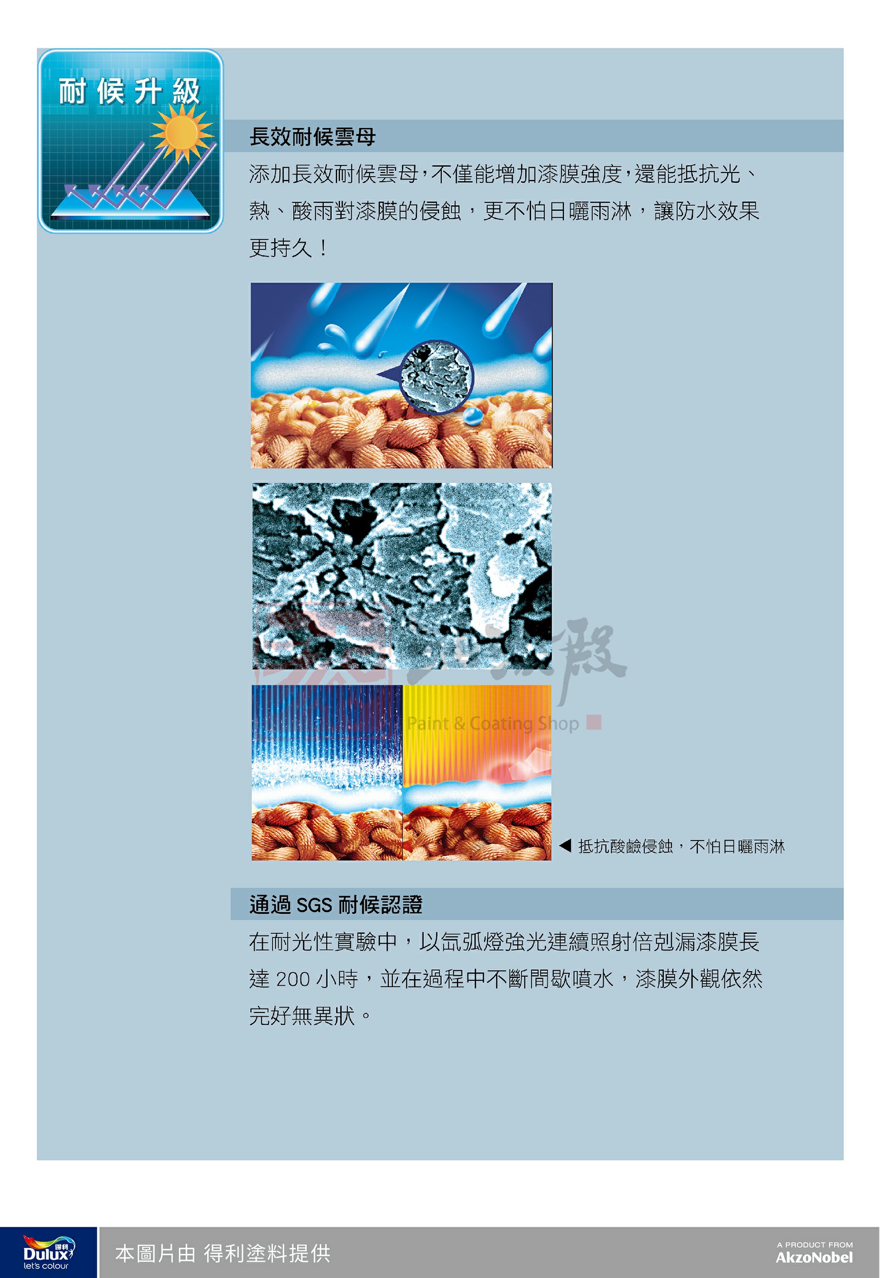 配方升級!添加長效耐候雲母,不僅能增加漆膜強度,還能抵抗光、熱、酸雨對漆膜的侵蝕,更不怕日曬雨淋,讓防水效果更持久!