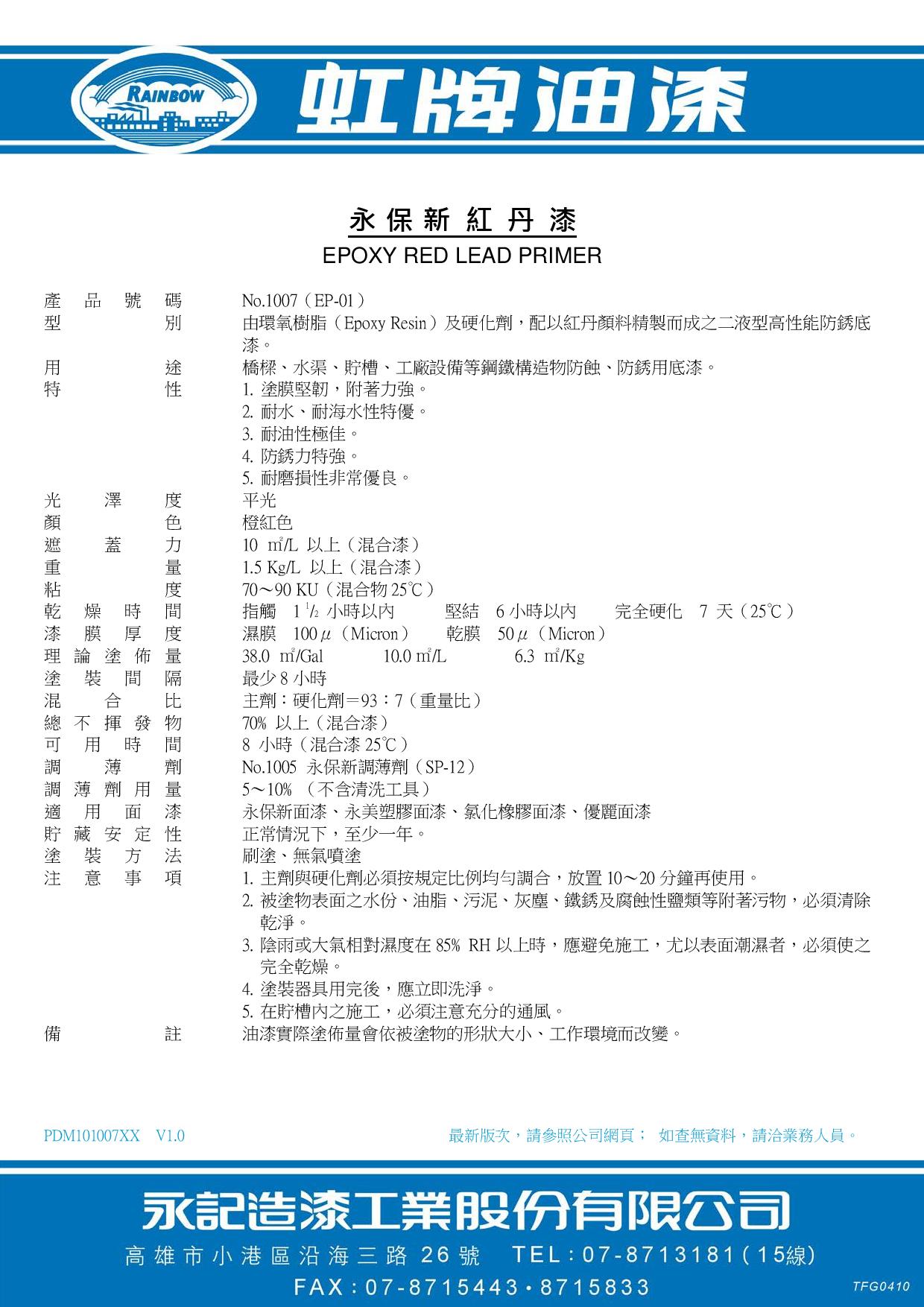 由環氧樹脂(Epoxy Resin)及硬化劑,配以紅丹顏料精製而成之二液型高性能防銹底漆。理論塗佈面積(1道):12 坪/加侖,建議塗布至少1道。
