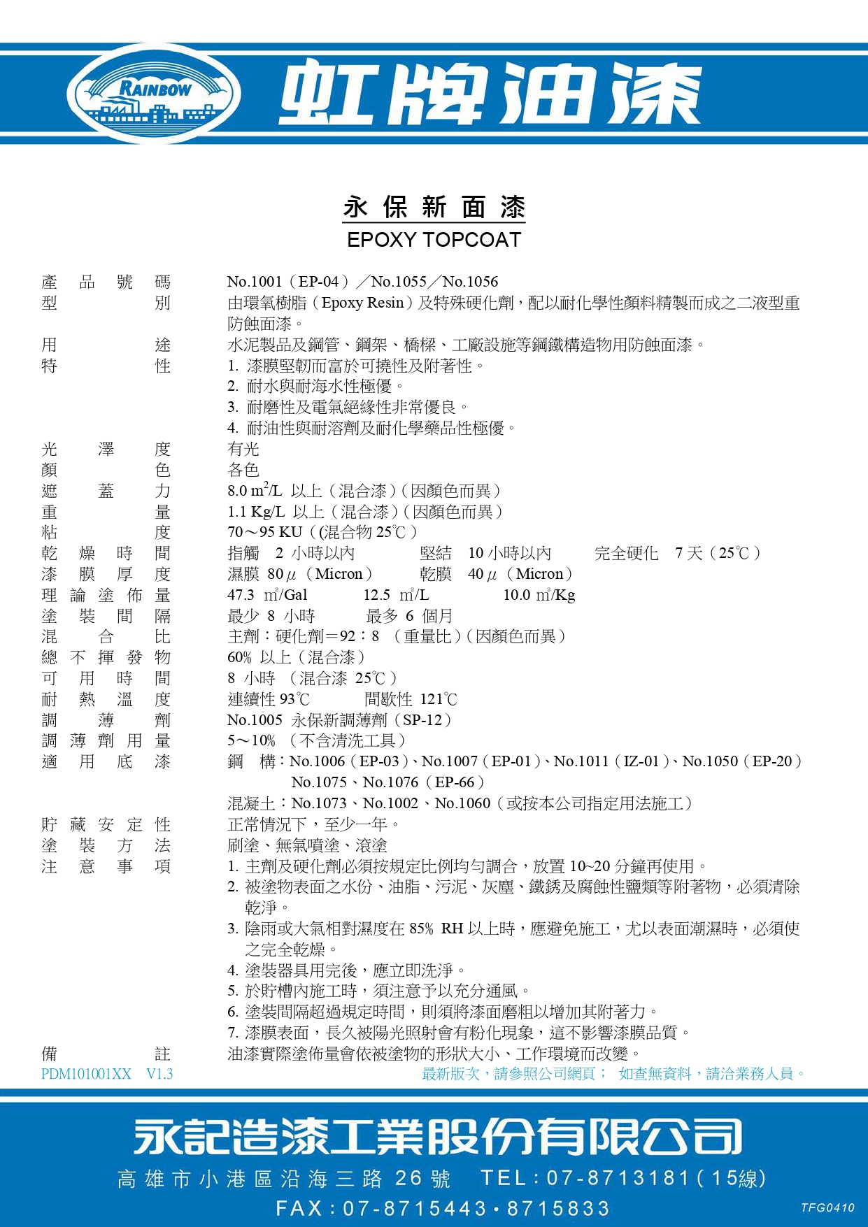 由環氧樹脂(Epoxy Resin)及特殊硬化劑,配以耐侯、耐化學性顏料精製而成之二液型重防蝕面漆。建議塗布至少2道,1加侖可塗刷7坪(刷2道的面積)。