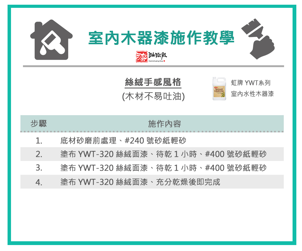 具有絲絨手感,韌性佳不回黏、耐刮耐水。理論塗佈面積(1道):3 坪/加侖,請依工序操作。