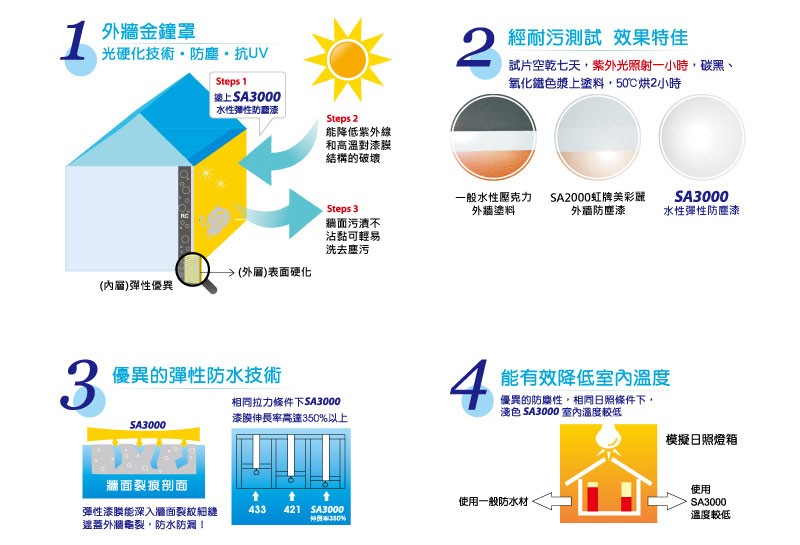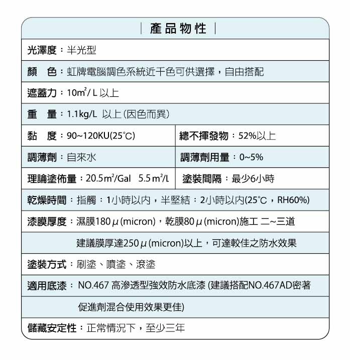 由耐水、耐鹼及耐候性非常優異之水性丙烯酸樹脂為主要成份,配合耐候顏料及添加劑精製而成之外牆專用高級水性彈性防塵塗料。建議塗布至少2道,1加侖可塗刷4坪(刷2道的面積)。