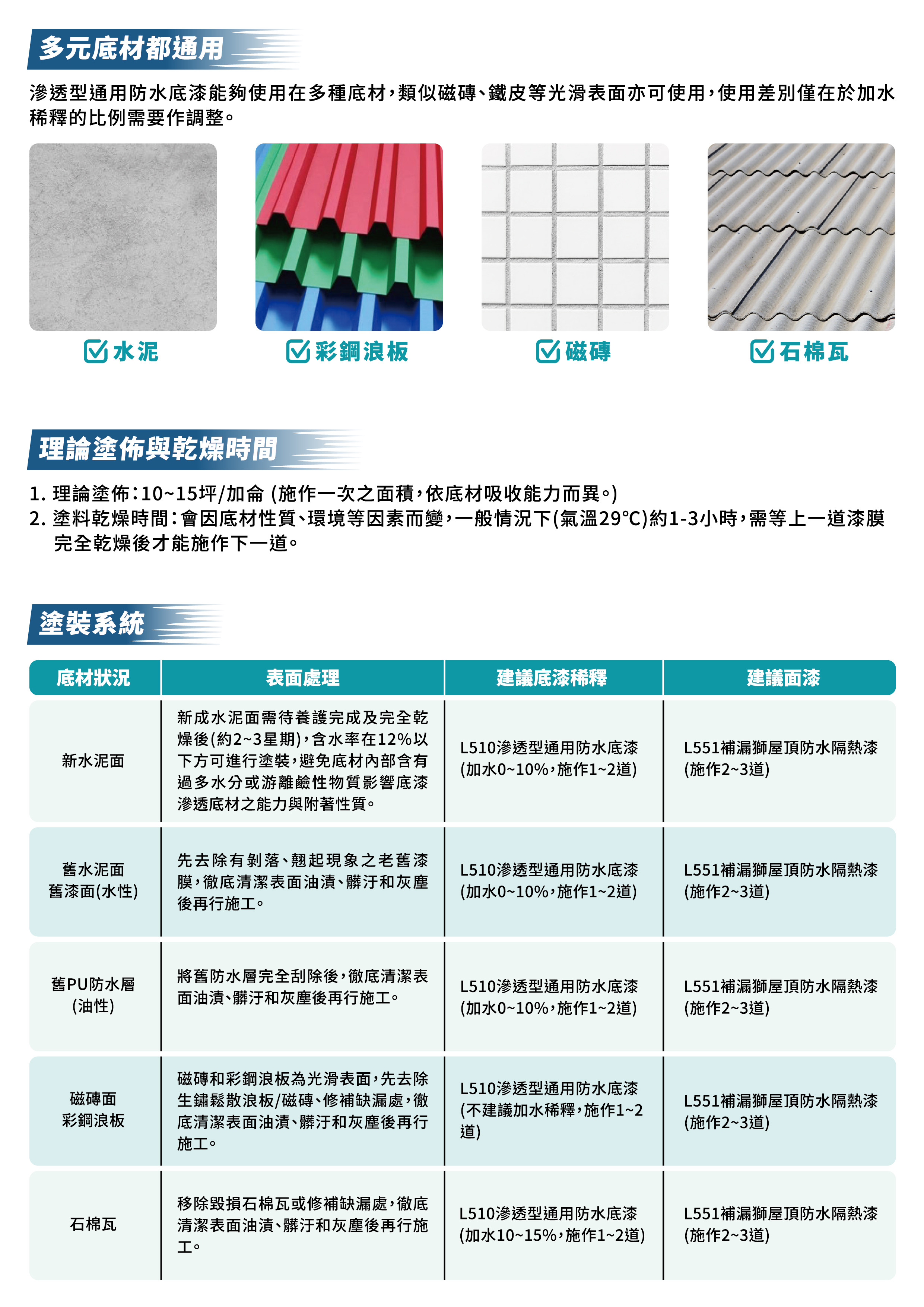 適用於水泥、磁磚、浪板鐵皮、石棉瓦等多種材質上的通用型防水底漆,增加面漆附著性與加強防水效果。理論塗佈面積(1道):15 坪/加侖,建議塗布至少1道。
