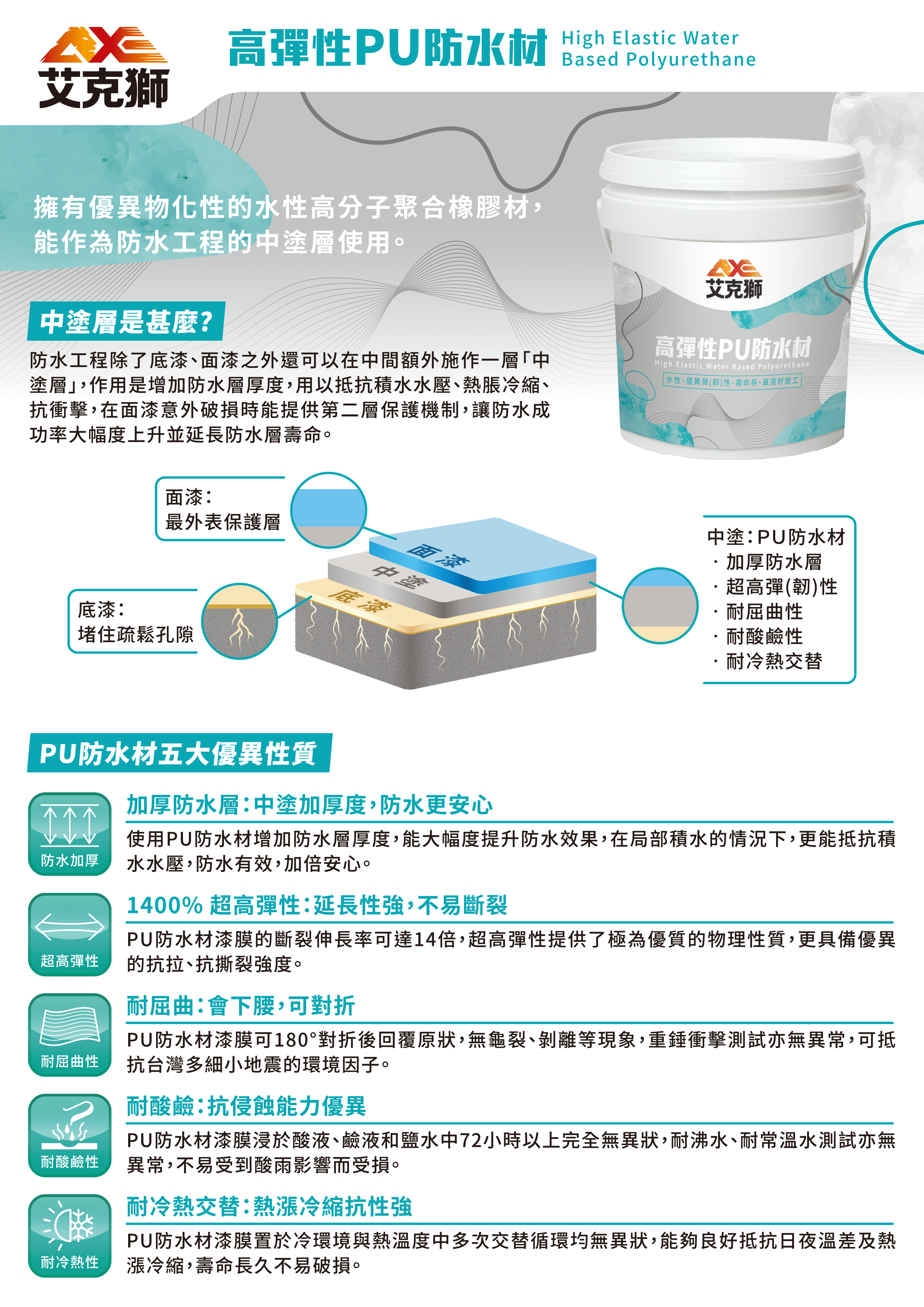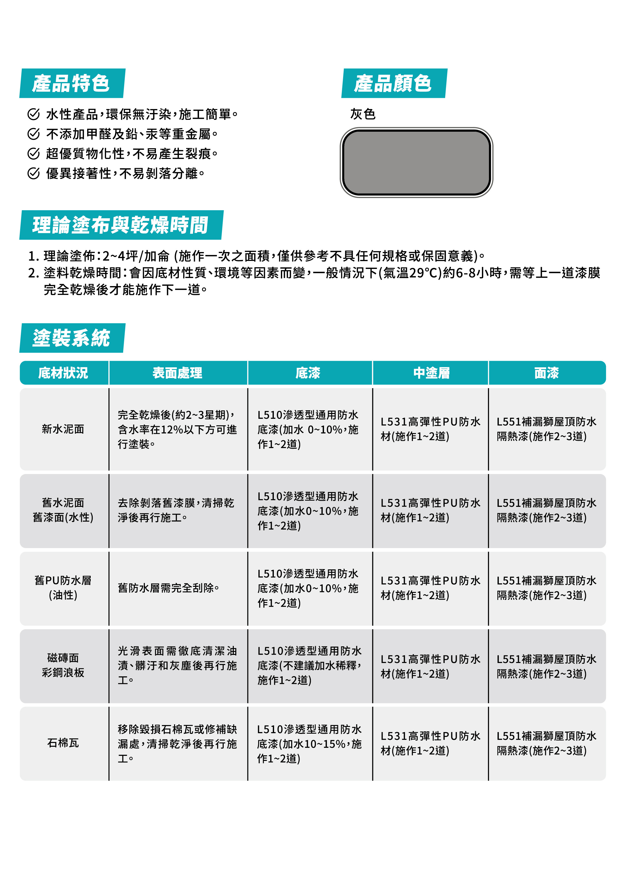 擁有優異物化性的高分子聚合橡膠材,能作為防水工程的中塗層使用。建議塗佈至少1道,1加侖可塗刷2~4坪(刷1道的面積)。