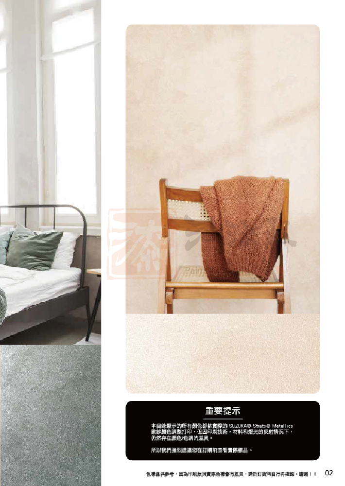 牆面1組能施作1.8-2.1坪。天花板1組能施作1.5-1.8坪。柔和又舒服的色調加上金屬飾面的處理,讓視感呈現出細緻、晶瑩 、靈動,宛如覆蓋在婚紗緞布面料上的真絲歐根紗,契合潮流又不脫古典氣息,完美呈現出室內空間的時尚感受。