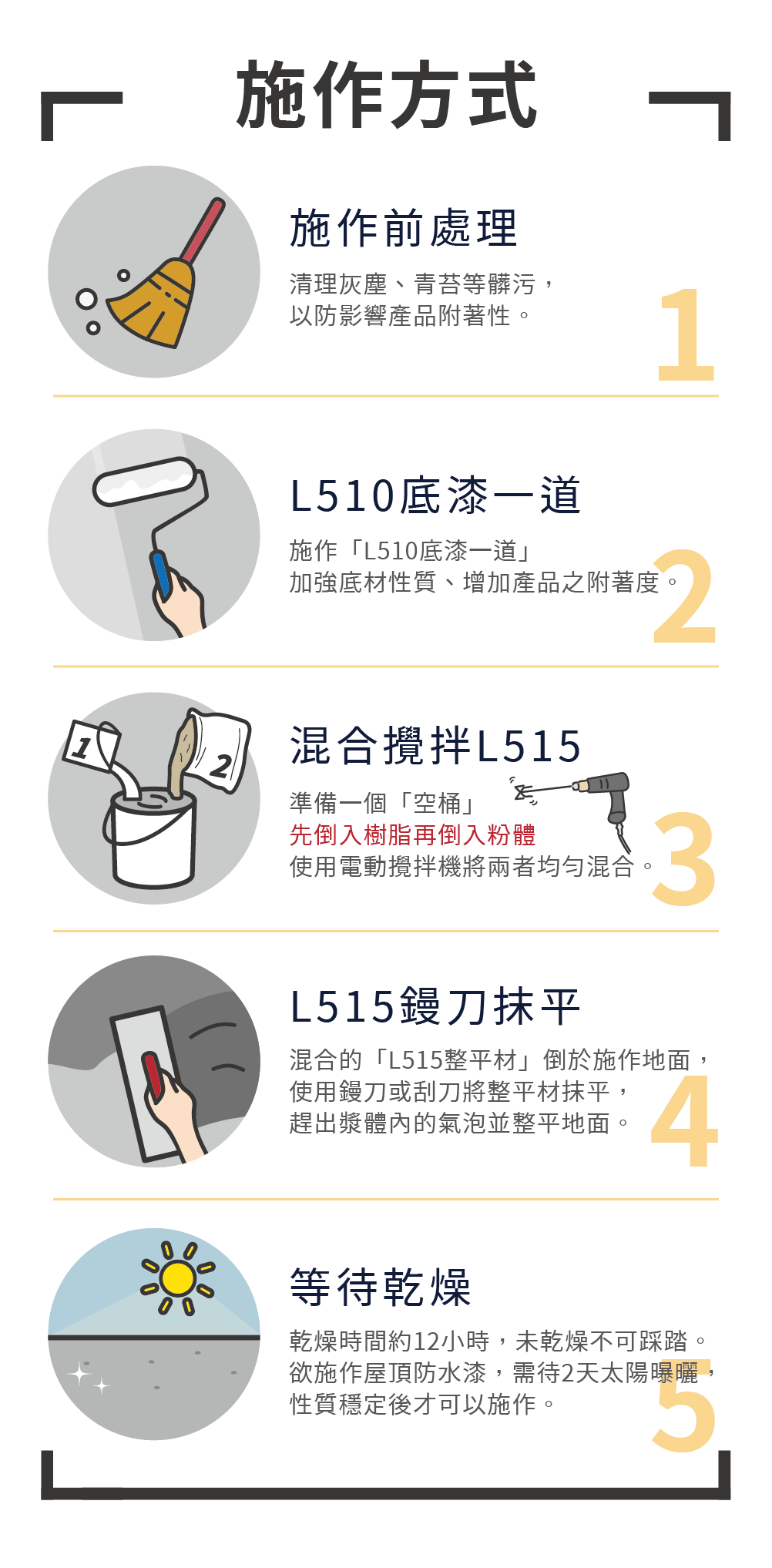 將原本坑坑巴巴的地面整平,可大大減少屋頂積水問題,後續搭配防水套組更完善。理論施作面漆(視底材凹凸程度而異,僅供參考不具任何規格或保固意義)小組(5kg樹脂+25kg粉體):約2坪(乾膜厚度2mm情況下)