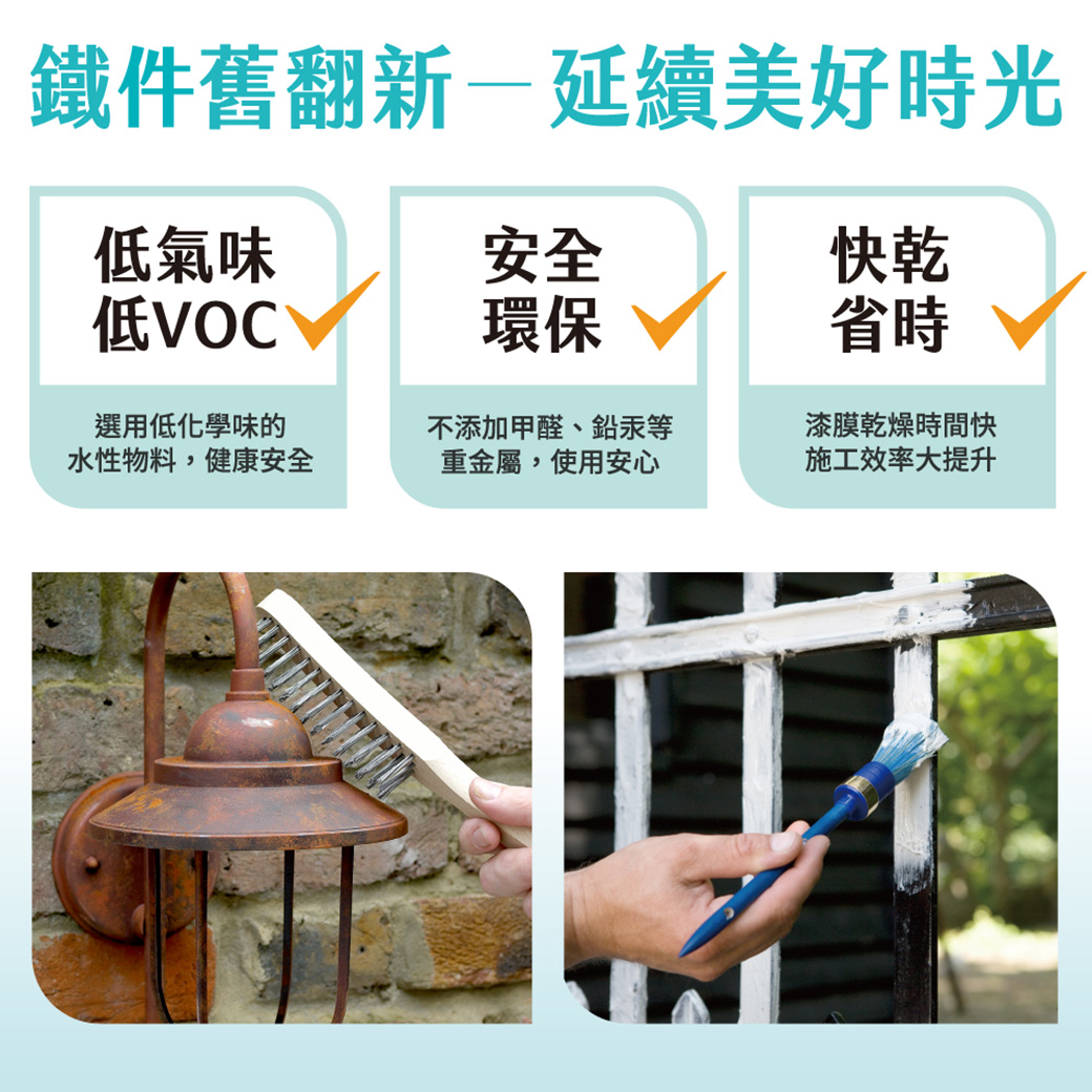 ★5年長效防鏽: 經ASTM B117-19實驗,防鏽效果通過192小時耐鹽霧測試,經換算可達5年以上自然暴露環境天數。 ★強化鐵件好上色: 好塗刷,搭配各種面漆容易施作,並可遮蓋底材讓面漆顏色更好呈現。 ★優異附著力: 強力接著鐵件、鋼材、欄杆、浪板等金屬材質。 ★低氣味 低VOC: 水性環保配方,告別紅丹漆刺鼻味及鉛毒性。1公升可塗1.7~2.6坪(※該產品規格選項加侖為5公升裝)