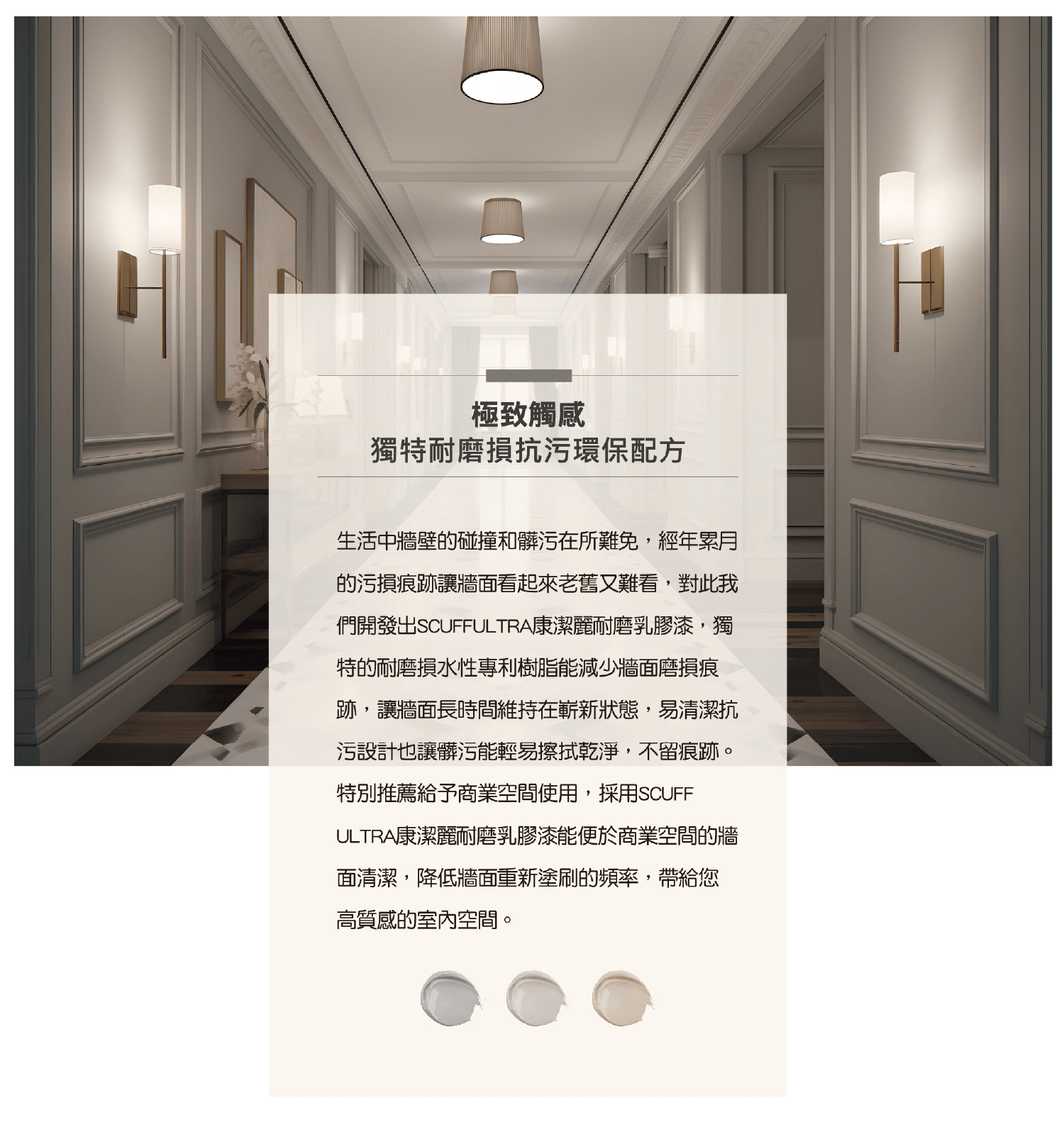 生活中在牆壁的碰撞和髒污在所難免,康潔麗耐磨乳膠漆採用了水性特殊樹脂,提供多一層保護及平坦的外觀。具有優越的耐久性且適合清潔,讓牆面輕鬆地就可以保持在嶄新狀態,不需頻繁地維護與修復,是居家空間、客廳、餐廳及走廊的理想選擇。2道工序:3公升裝可塗刷5.3坪(註:間隔塗裝至少需等待3小時以上)