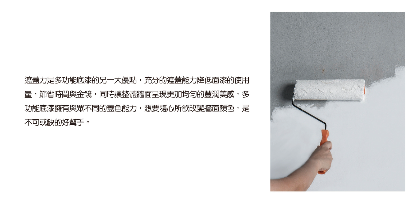擁有良好的附著性,可適用於多種底材,例如:R.C混凝土、批土、塗裝板、矽酸鈣板、發泡板、系統櫃板材、美耐板、波利板等等,能抑制牆面黴菌滋生,具有優異的耐鹼、耐水性能。多功能底漆提供四款顏色選擇,施作底漆時同時具有蓋色效果,有助於面漆塗刷時上色度更好!2道工序:1加侖裝可塗刷6坪(註:間隔塗裝至少需等待3小時以上)