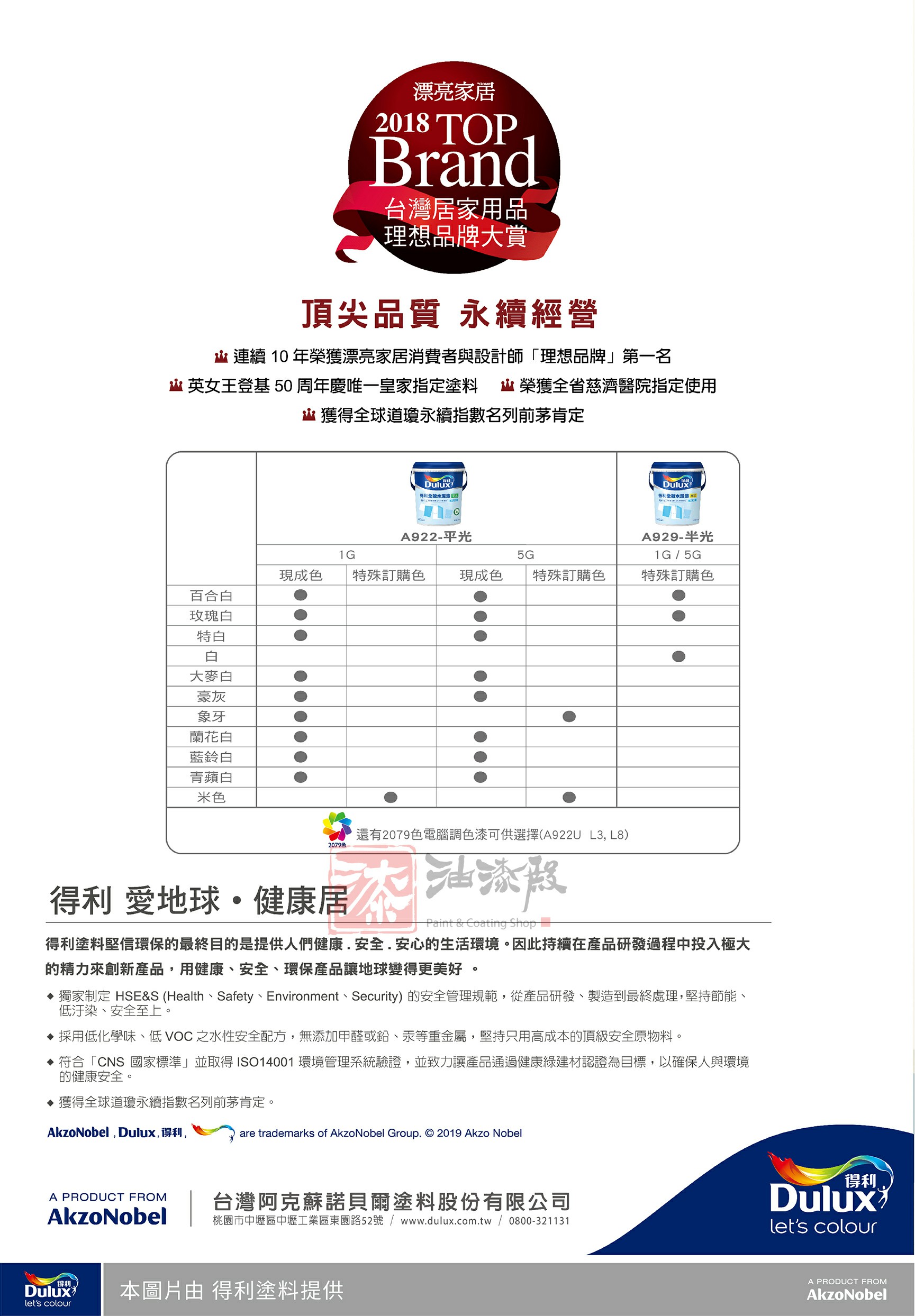 除了平光9種現成漆色,更提供多達2079色的電腦調色漆。涵蓋紅橙黃綠藍紫等,提供多樣化的色彩選擇。