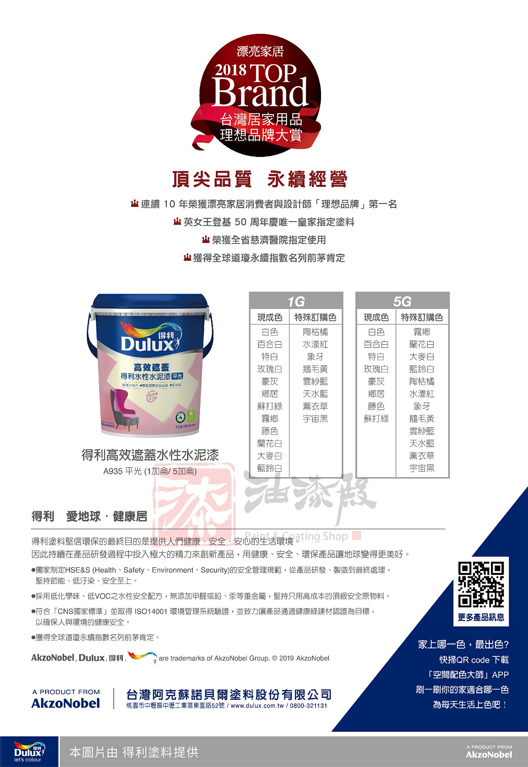 具備高遮蓋力,施工方便,業界第一通過UL檢測的水泥漆。建議塗布至少2道,1加侖可塗刷6坪(刷2道的面積)。