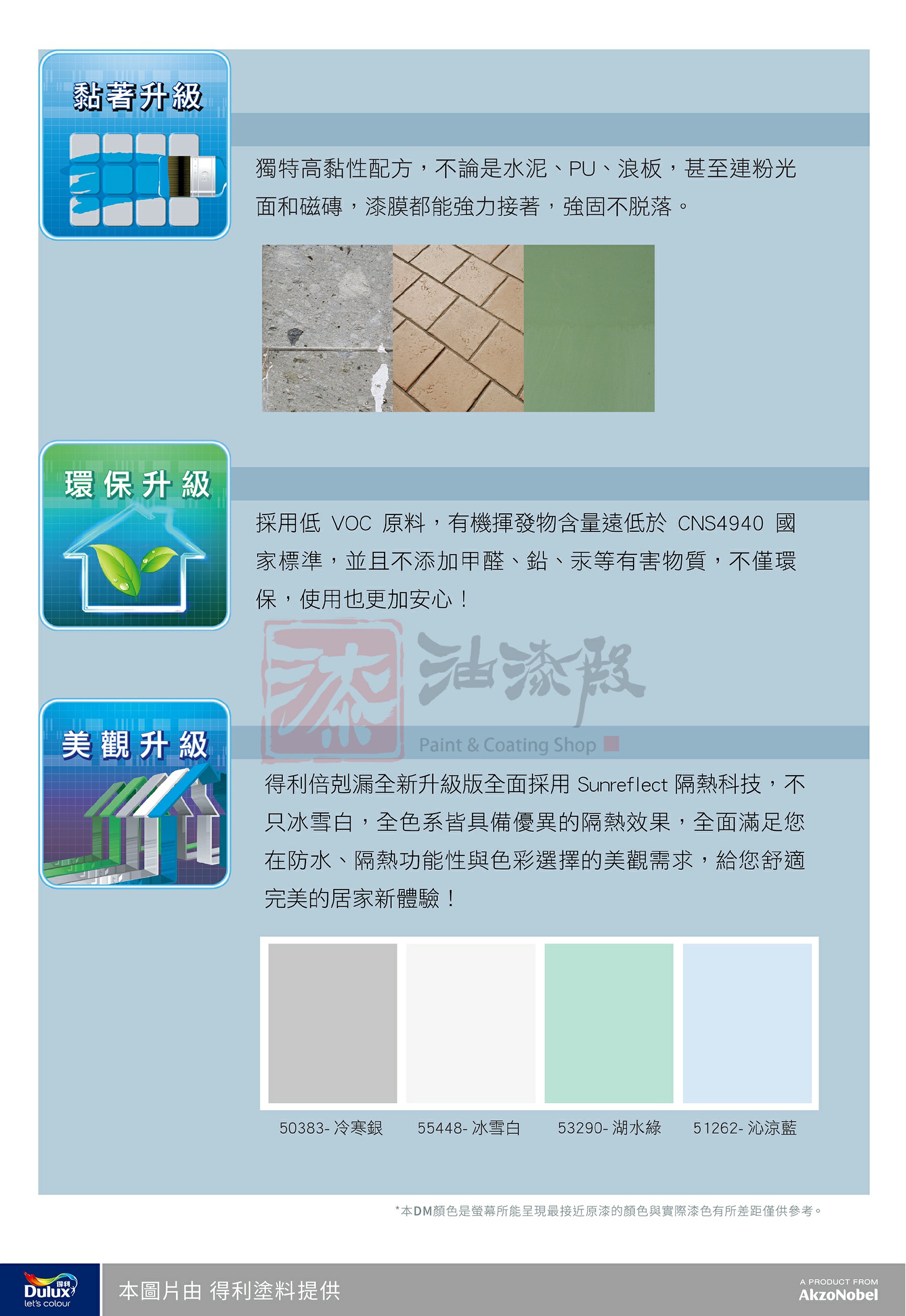 想要一次搞定防水、隔熱,就用得利倍剋漏∘顛覆傳統防水漆延展性差、日曬容易變硬脆化的缺點, 得利倍剋漏防水超耐配方,含Fibrado隔水纖維和具備500%漆膜彈性,還加了長效耐候雲母, 提高漆膜耐酸鹼性,漆膜耐候的強度變強,就不怕酸雨或是長時間曝曬在陽光下,防水效果更持久, 這就是倍剋漏效果長達5年的秘密。
