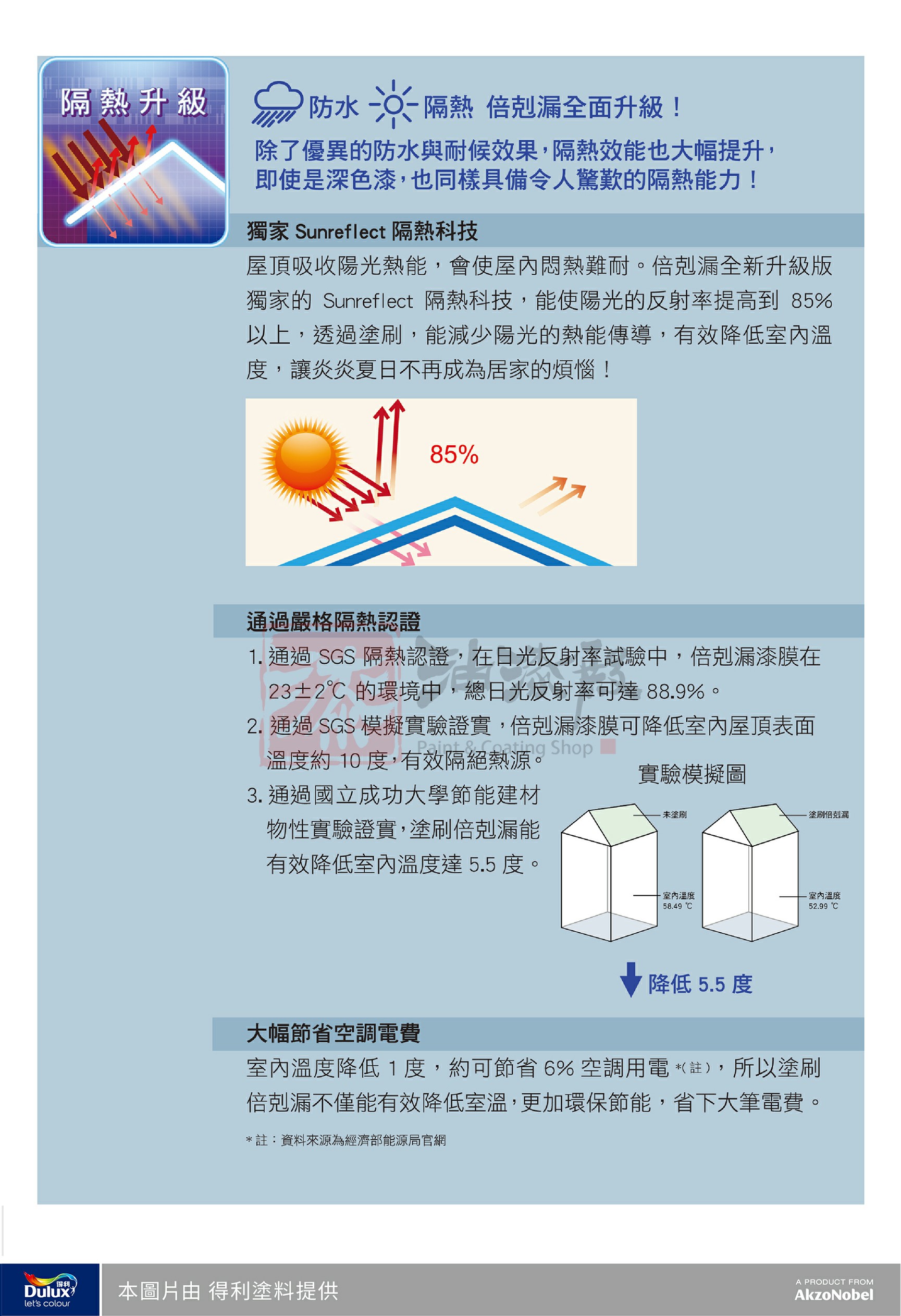 得利倍剋漏除了具有優異的防水與耐候效果,隔熱效能也不幅提升,採用獨步全球的Sunreflect隔熱科技, 能使陽光的反射率提高到85%以上。透過塗刷,就能減少熱吸收傳導,大幅降低屋頂表面溫度約10度, 降低室內溫度5度以上。即使用深色漆,也同樣具備令人驚歎的隔熱能力!