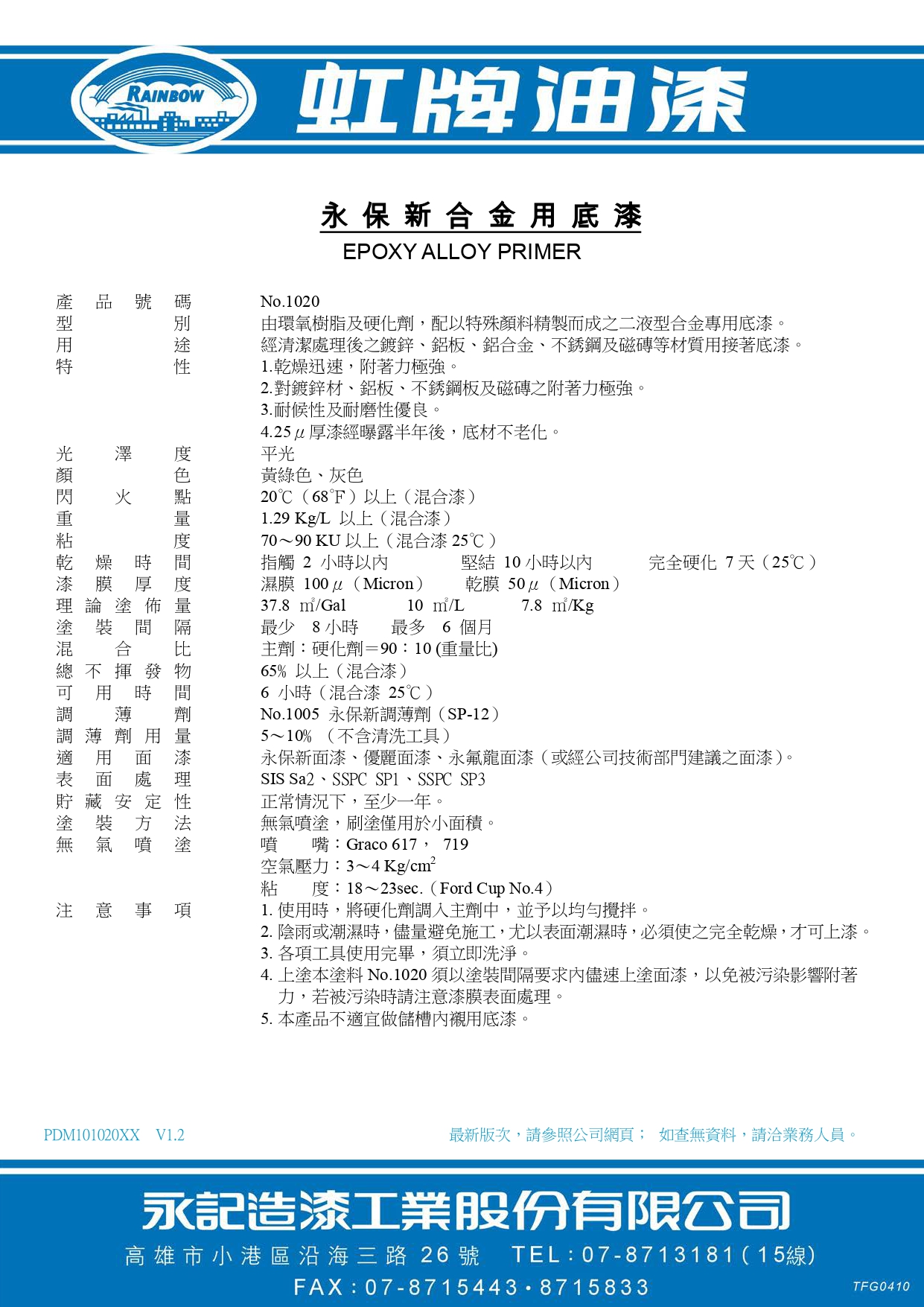 由環氧樹脂(Epoxy)及硬化劑,配以特殊顏料精製而成之二液型合金專用底漆。理論塗佈面積(1道):11 坪/加侖,建議塗布至少1道。