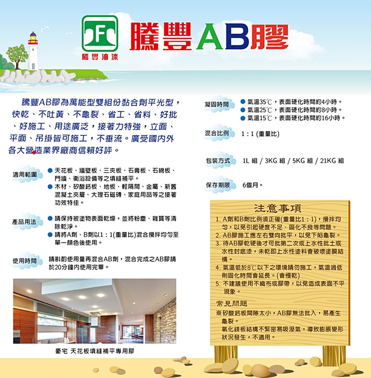 適用於天花板、牆壁板、矽酸鈣板、地板等之填縫補平。此產品為一組:含A劑3公斤+B劑3公斤,使用前請以1:1之比例均勻混合。