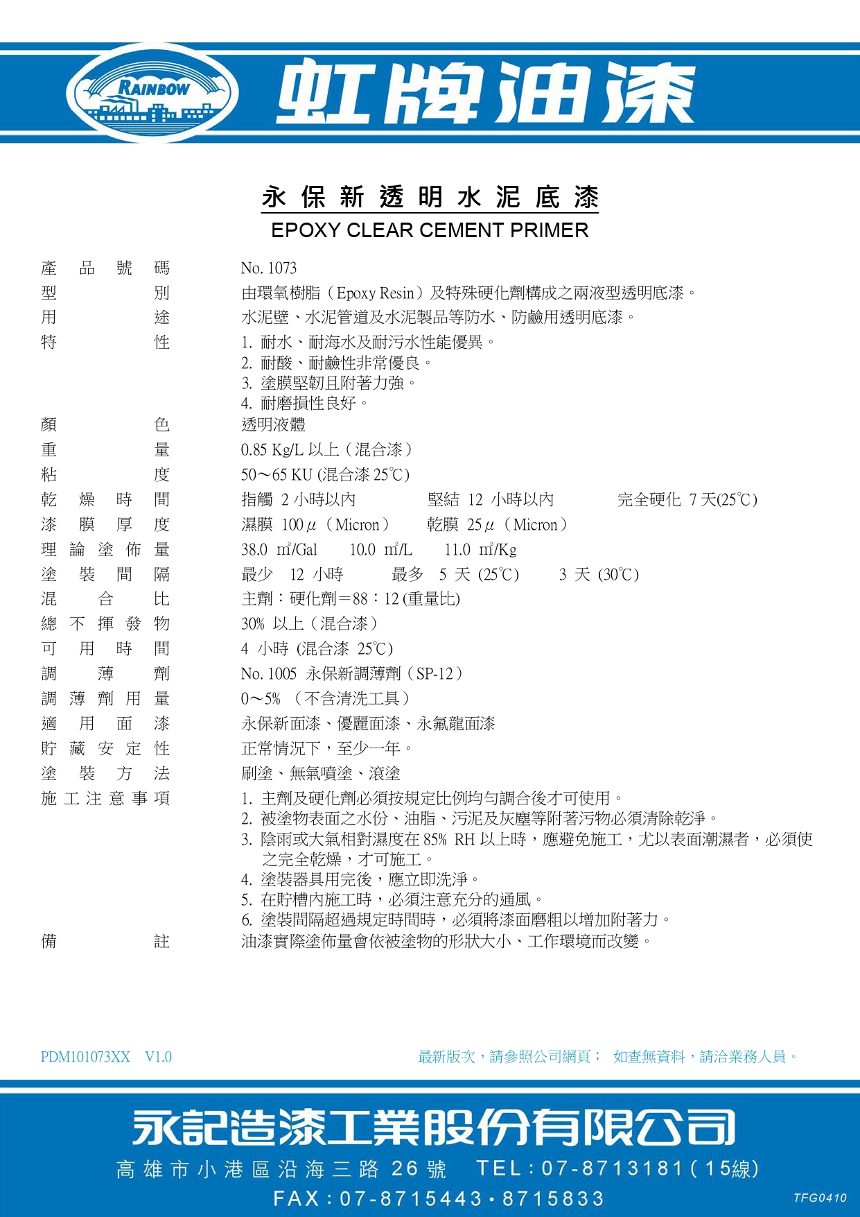 由環氧樹脂(Epoxy Resin)及特殊硬化劑構成之兩液型透明底漆,適用在水泥表面。理論塗佈面積(1道):11 坪/加侖,建議塗布至少1道。