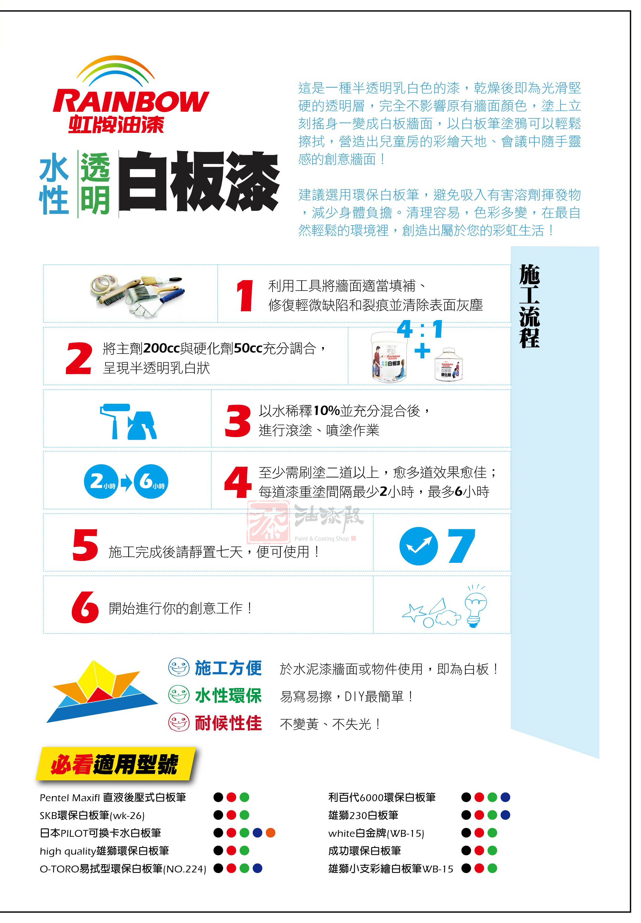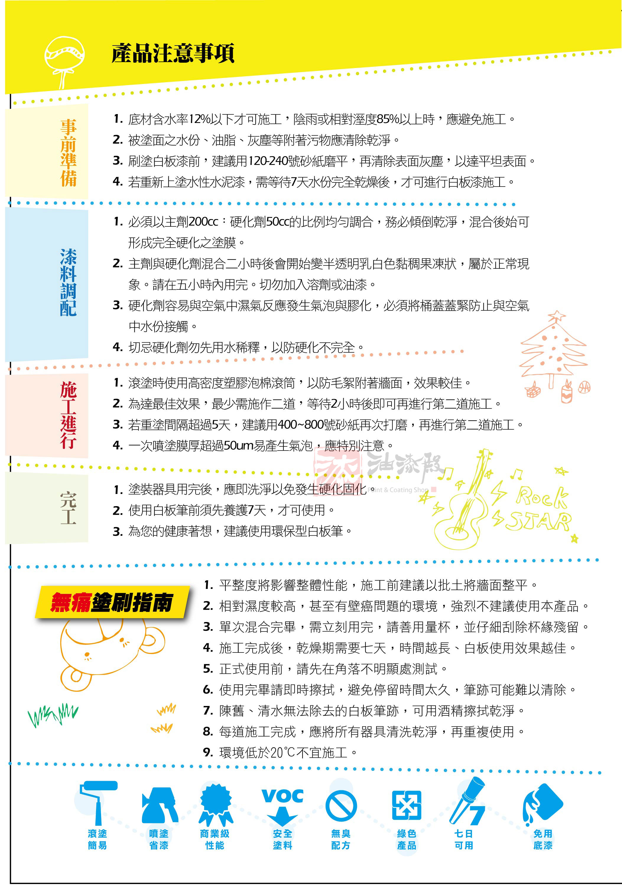 施作於室內水泥漆牆面、做寫字、塗鴉等用途,容易擦拭,不留痕跡。建議塗布至少2道,1加侖可塗刷2坪(刷2道的面積)。