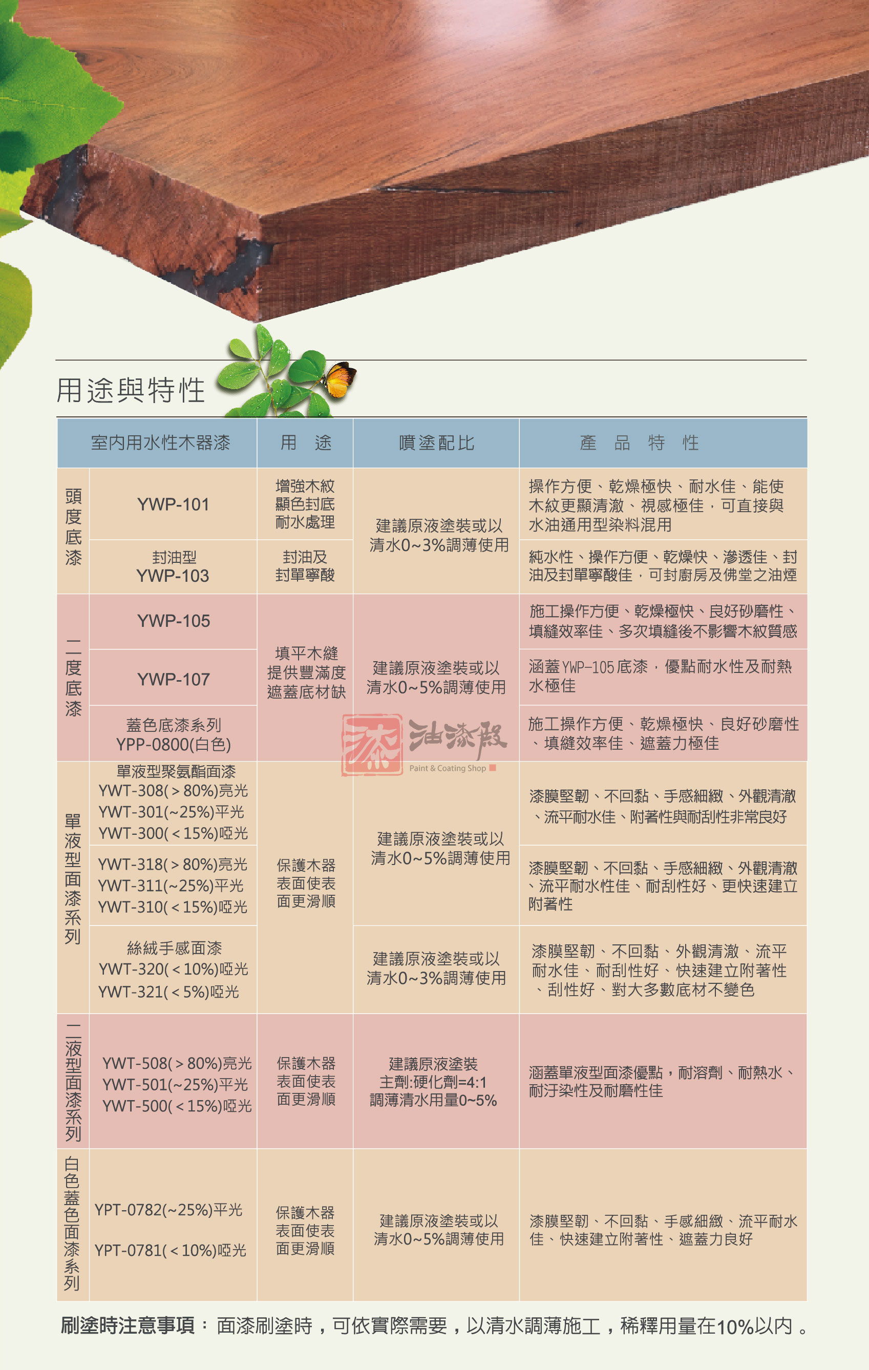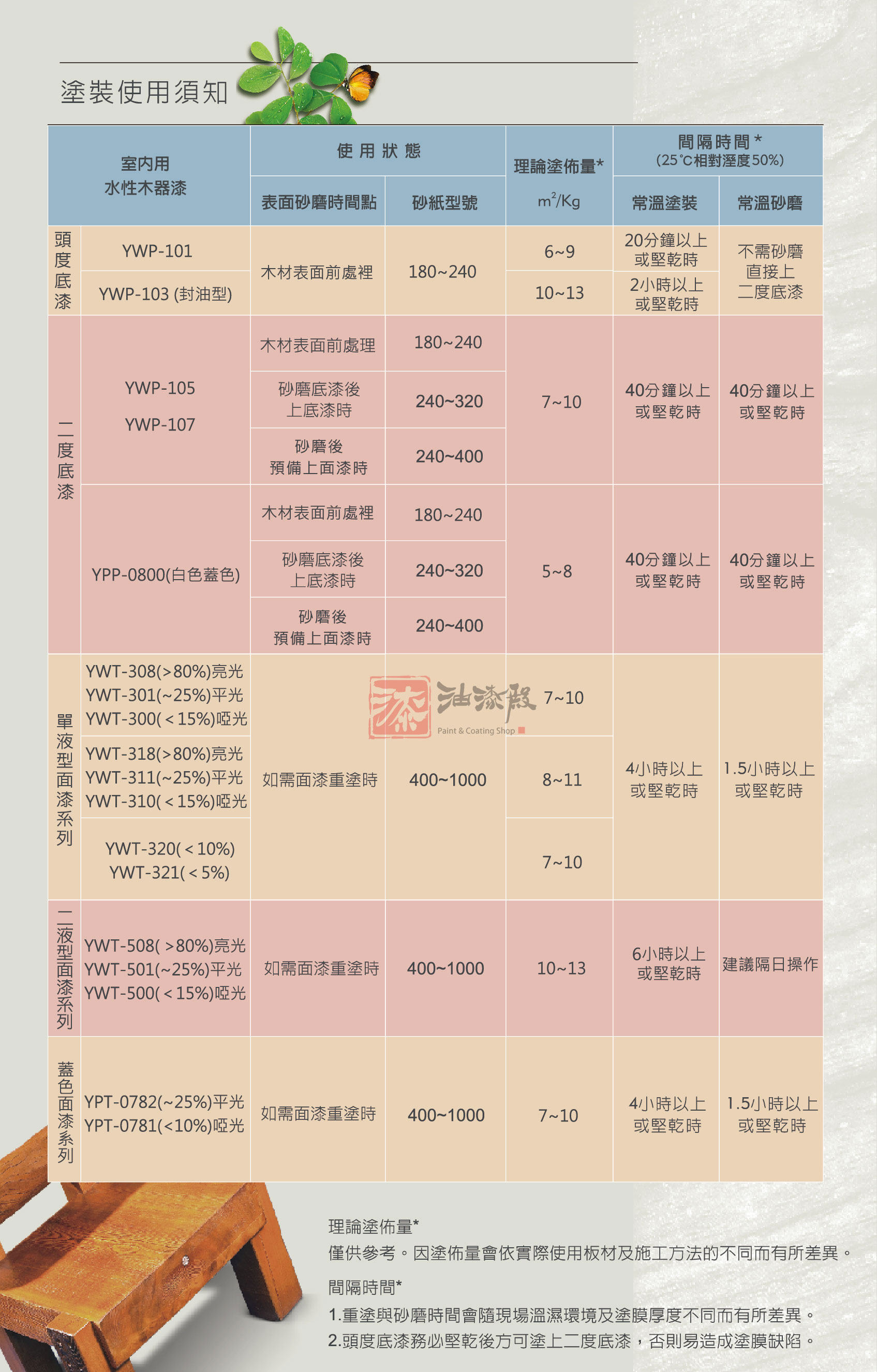 家俱、衣櫥、陳列櫃、壁板等木製品之面漆(有光、平光、啞光),理論塗佈面積(1道):3 坪/加侖,請依工序操作。