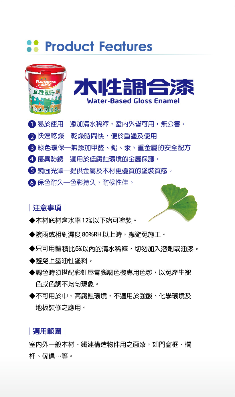 適用於金屬及木質家具的保護,為特殊高性能合成樹脂搭配耐候型顏料所精製而成之單液型面漆,建議塗布至少2道,1公升可塗刷1.5坪(刷2道的面積)。