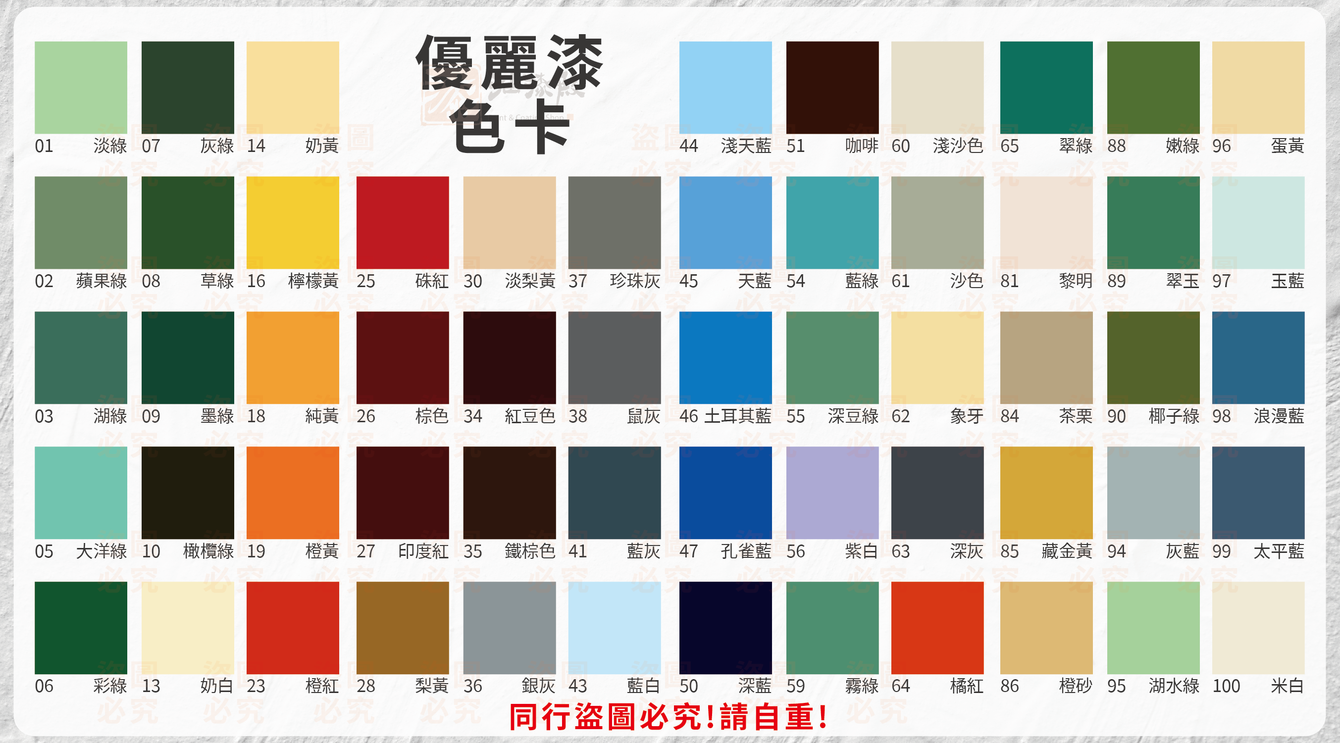建議塗刷兩道,每加侖可塗刷9坪(兩道),車輛、木製品及金屬、塑鋼(F.R.P.)等製品之面塗用色漆。由壓克力樹脂及 Polyol Resin 聚合物及不變黃聚異氰酸酯(Polyisocyanate)硬化劑構成。