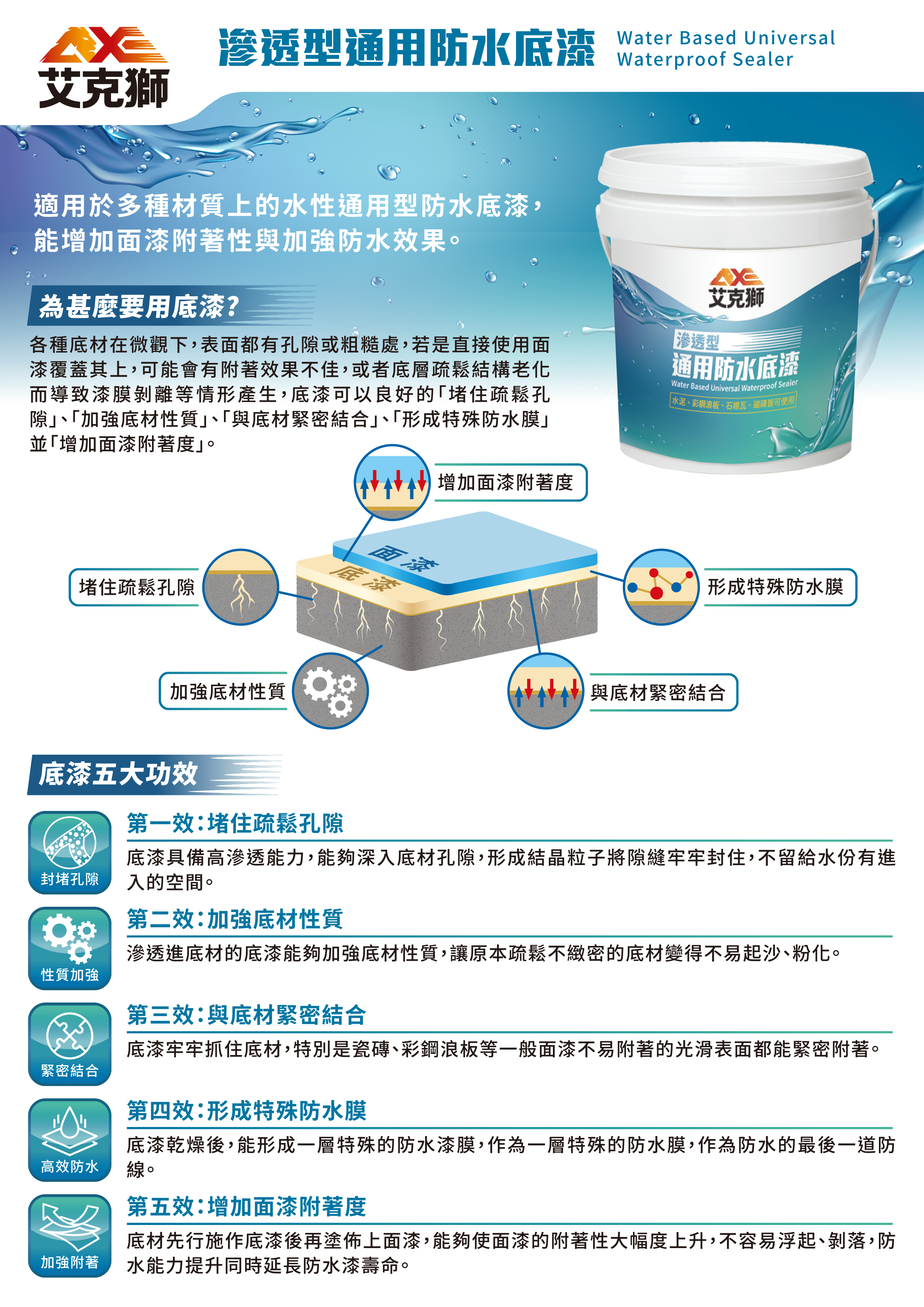 適用於水泥、磁磚、浪板鐵皮、石棉瓦等多種材質上的通用型防水底漆,增加面漆附著性與加強防水效果。理論塗佈面積(1道):15 坪/加侖,建議塗布至少1道。