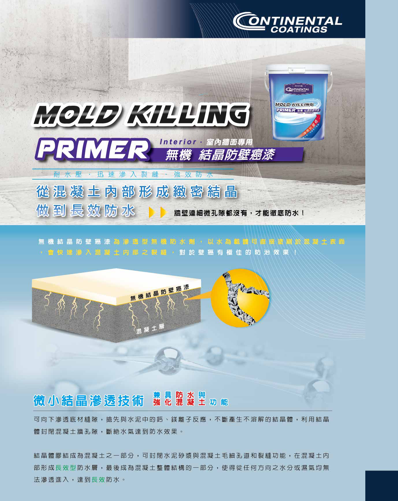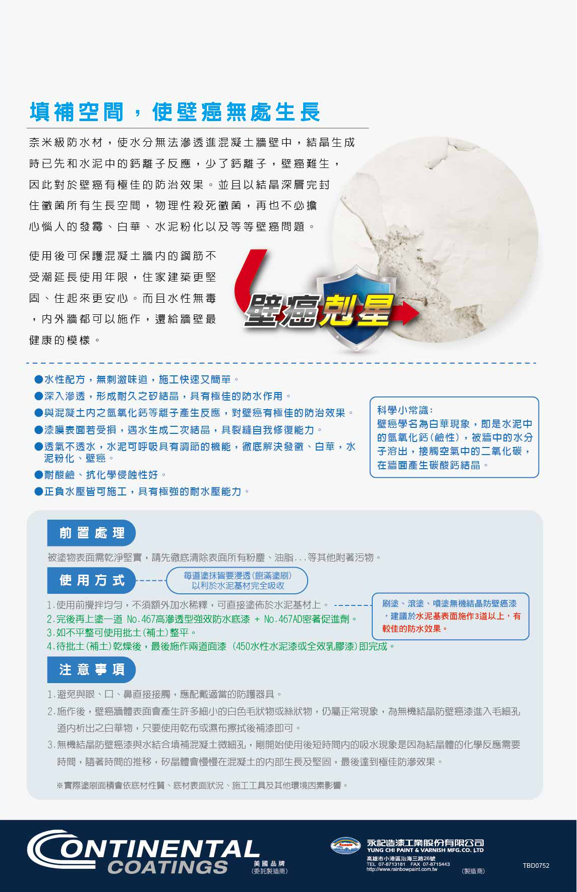 【商品內容】1公升-無機結晶防壁癌漆、0.5公升-467AD密著促進劑、1公升-467高滲透型強效防水底漆無機結晶防壁癌漆為滲透型無機壁癌處理劑,以水為載體可直接塗刷於混凝土表面,會快速滲入混凝土內部之裂縫,搶先與水泥中的鈣、鎂離子反應,生成不溶解的矽晶體,進而膠結成為混凝土之一部分,對於壁癌有極佳的防治效果。