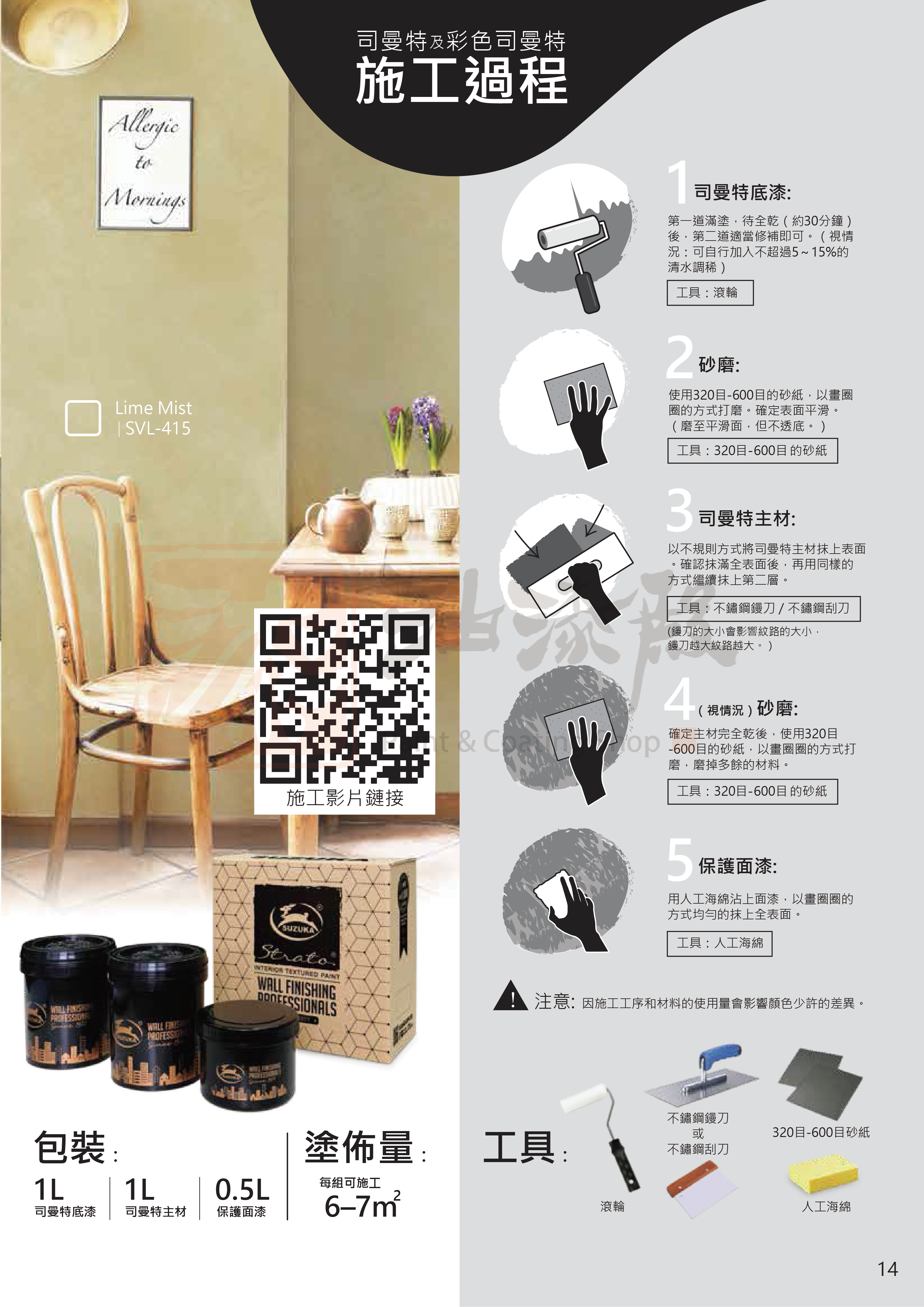 1組能施作1.8-2.1坪。司曼特灰泥塗材,能簡易的營造出水泥紋理及清水混凝土的質感。是居家、辦公室、商業空間,呈現工業風的最佳選擇。