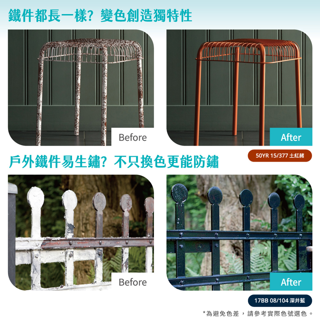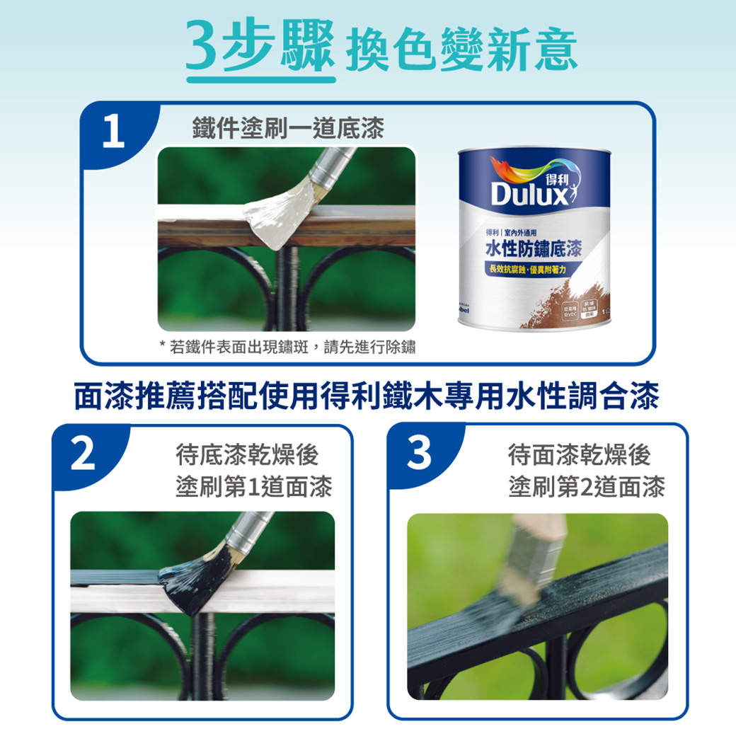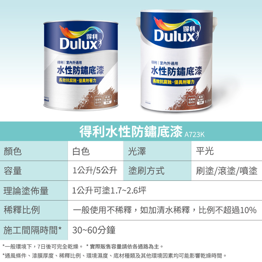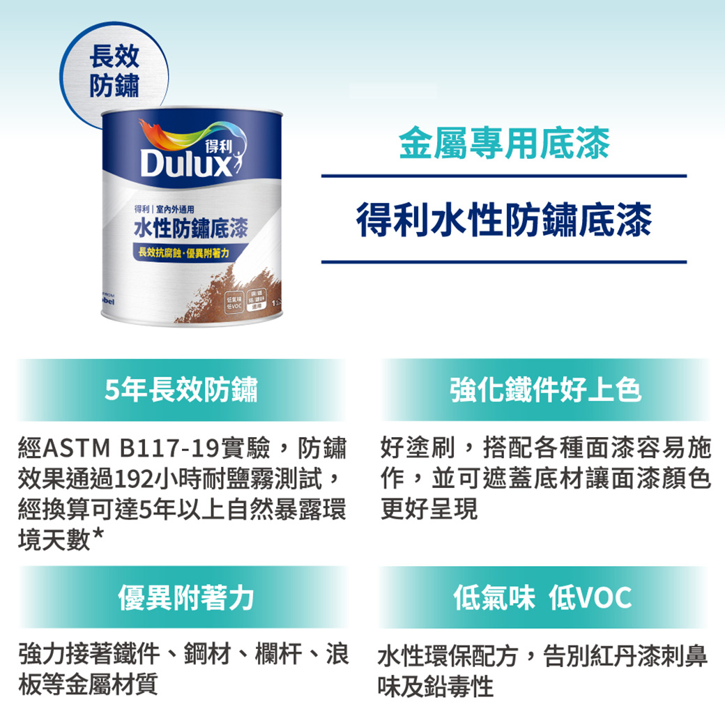 ★5年長效防鏽: 經ASTM B117-19實驗,防鏽效果通過192小時耐鹽霧測試,經換算可達5年以上自然暴露環境天數。 ★強化鐵件好上色: 好塗刷,搭配各種面漆容易施作,並可遮蓋底材讓面漆顏色更好呈現。 ★優異附著力: 強力接著鐵件、鋼材、欄杆、浪板等金屬材質。 ★低氣味 低VOC: 水性環保配方,告別紅丹漆刺鼻味及鉛毒性。1公升可塗1.7~2.6坪(※該產品規格選項加侖為5公升裝)