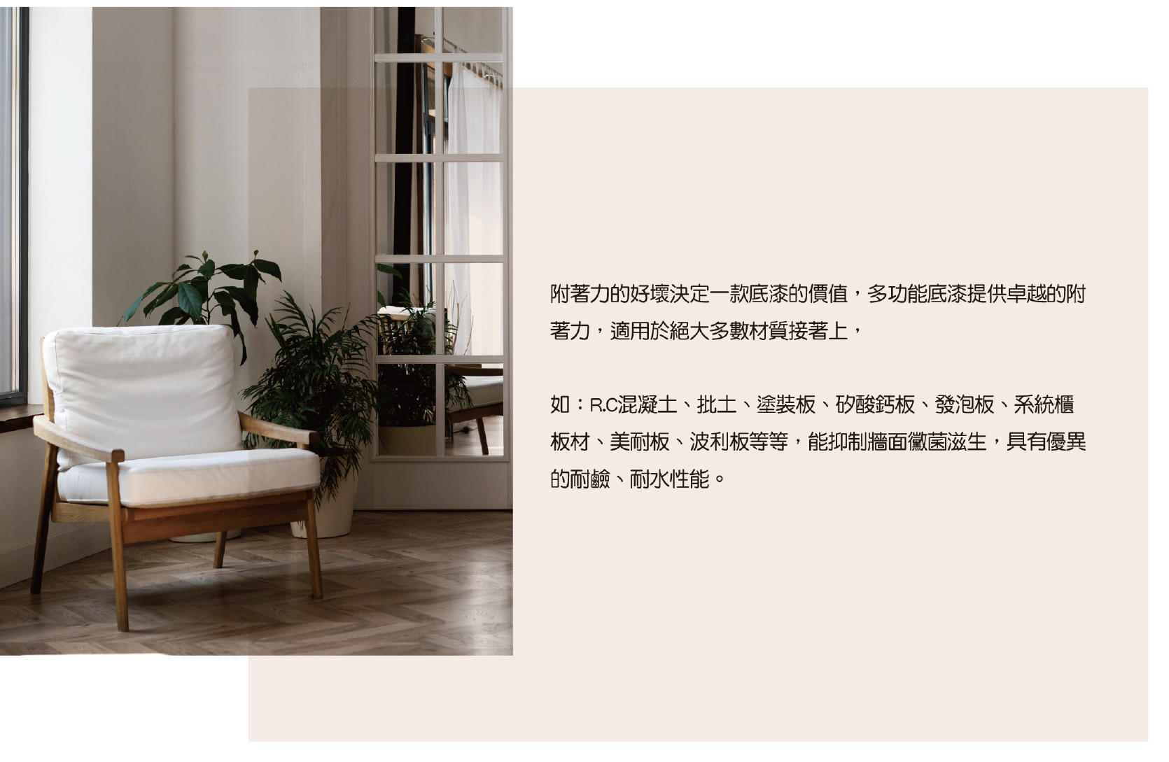 擁有良好的附著性,可適用於多種底材,例如:R.C混凝土、批土、塗裝板、矽酸鈣板、發泡板、系統櫃板材、美耐板、波利板等等,能抑制牆面黴菌滋生,具有優異的耐鹼、耐水性能。多功能底漆提供四款顏色選擇,施作底漆時同時具有蓋色效果,有助於面漆塗刷時上色度更好!2道工序:1加侖裝可塗刷6坪(註:間隔塗裝至少需等待3小時以上)